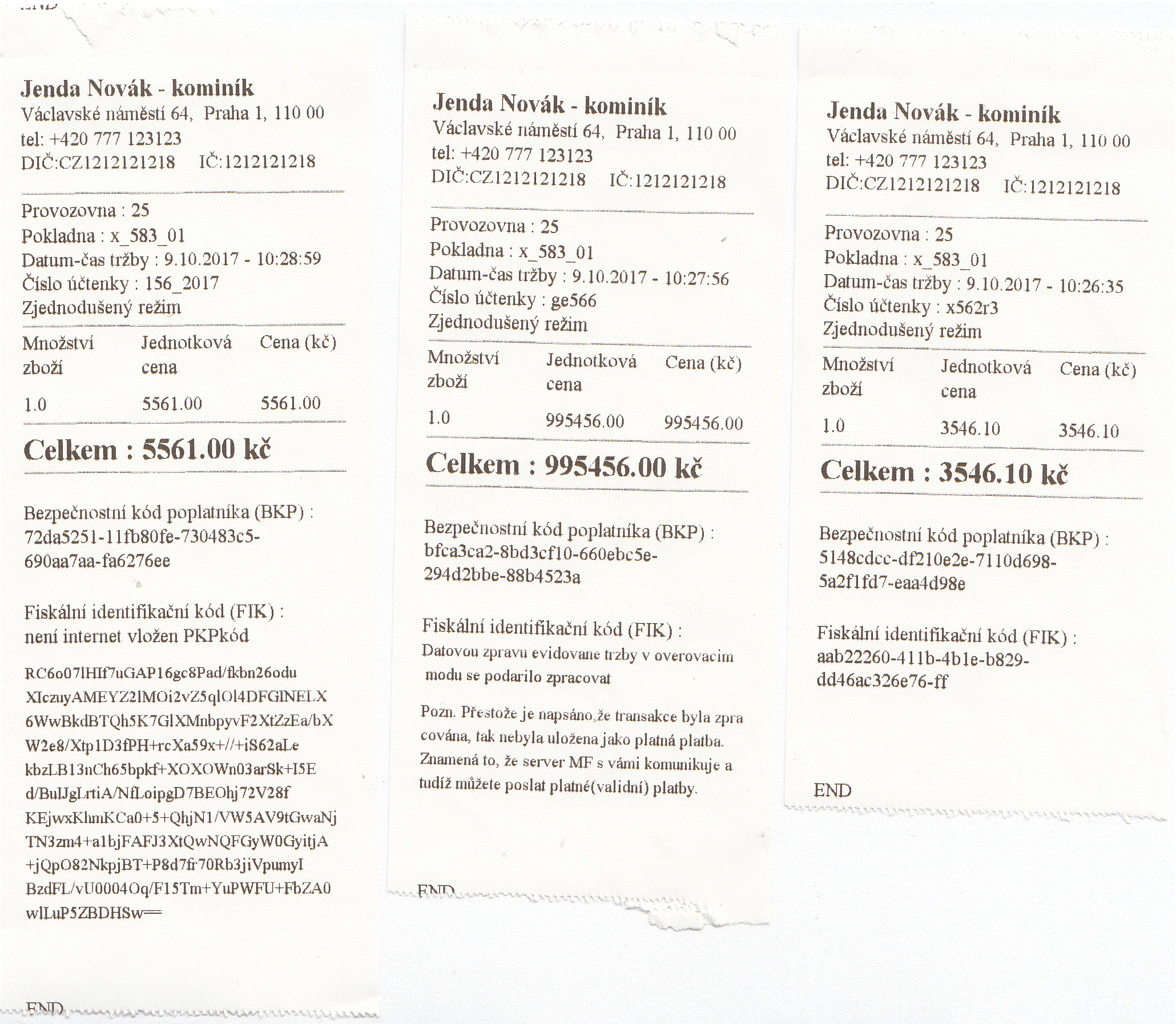 Na nascenovaném obrázku lze vidět jaké typy pokladních účtenek program vytváří.Minimální obsah informací o obsahu účtenky jsou definované zákonem 112/2016. První typ účtenky se vytiskne v případě nefunkčního internetového připojení. Druhý typ účtenky se vytiskne při testovacím transkakci(tvz. ověřovací mód) se servery MF. Třetí účtenka je účtenka která se vytiskne v případě funkčního internetu a dojde k zaregistrovaní platby na serverech MF.